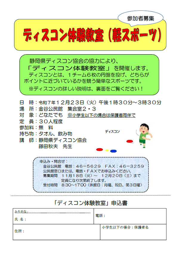 静岡県ディスコン協会の協力により、 「ディスコン体験教室」を開催します。 ディスコンとは、1チーム6枚の円盤を投げ、どちらがポイントに近づいているかを競う 簡単なスポーツです。 ※ディスコンの詳しい説明は、募集チラシをご覧ください!