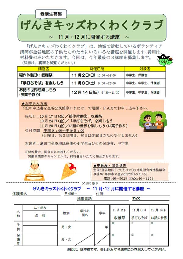 地域で活動しているボランティア講師が金谷地区の子供たちのためにいろいろな講座を開催します。費用は、材料費のみいただきます。今回は、今年最後の3講座をご案内します。
